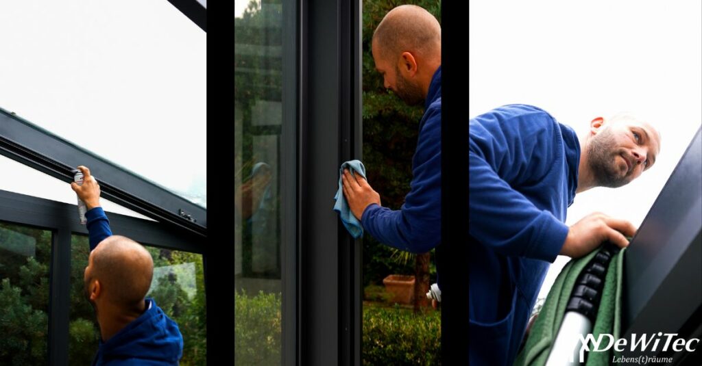 Bevor Frost und Schnee einsetzen, sollten Glasflächen, Profile und Markisentücher sorgfältig gereinigt werden. Verwenden Sie milde Reinigungsmittel, ein weiches Tuch oder einen Schwamm – aggressive Chemikalien oder Hochdruckreiniger können empfindliche Oberflächen beschädigen. Besonders wichtig: Entwässerungsrinnen und Ablaufkanäle von Laub und Schmutz befreien, damit Regen- und Schmelzwasser ungehindert ablaufen können.